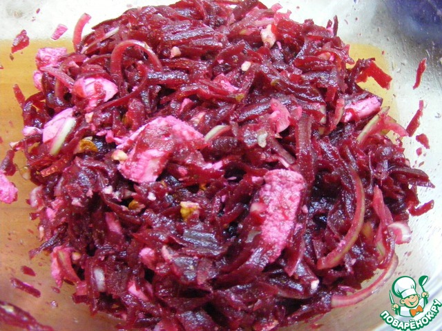 Смешать свеклу и лук. Залить маринадом, хорошо промешать и отставить, пусть маринуются.