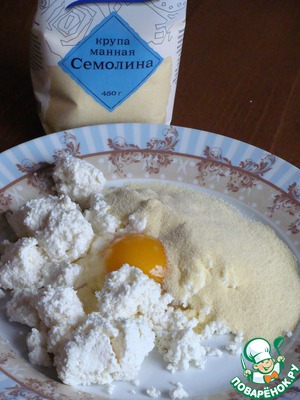 • Смешать 200 г творога, 1 яйцо, 4 ст. л. манной крупы.
