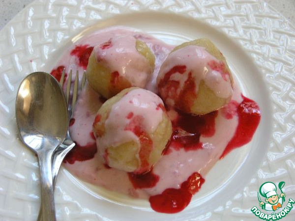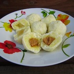 Как вариант начинки- поджарить лук, копченое мясо, мелко порезанное и начинить кнэдлики. Подавать с кислой тушёной капустой. Сверху на готовые кнэдлики дать поджаренный лук. И пивом запить-))!!