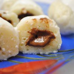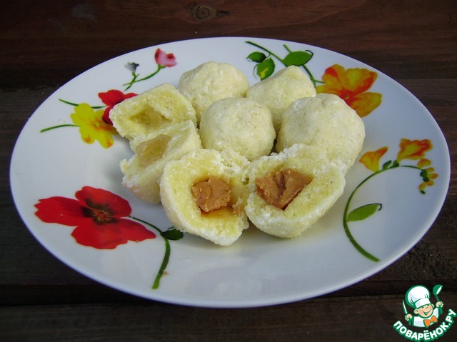 Начинка может быть любая - у меня два вида шоколада (белый и молочный) и вареная сгущенка. Края защипнуть и сформовать шарики.