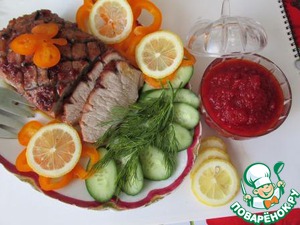 Вкусное, нарядное блюдо. Мясо получается сочным, мягким и ароматным, а времени на его приготовление требуется совсем немного. Никаких тебе маринований, замачиваний и т. д. Рецепт узнала из книги А. Скрипкиной. С тех пор готовлю часто и на праздничный стол, и для узкого семейного круга. Можно подать на горячее, а можно и на закуску. Советую приготовить.