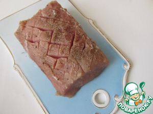 Мясо обмоем холодной водой, хорошо обсушим, посолим и поперчим со всех сторон. Сделаем на мясе косые надрезы сеточкой (глубина до 1 см), посолим в надрезах.