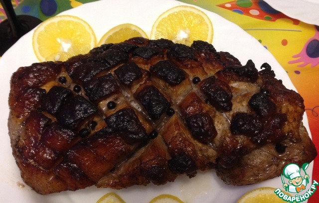 Уложим наше мясо в форму, обмажем со всех сторон глазурью, вставим в надрезы бутончики гвоздики.