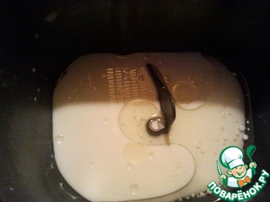 Итак, приступим. Я тесто замешивала в хлебопечи. В моей ХП нет режима замеса пресного теста. Я пользуюсь режимом «Дрожжевого теста», только через 15 минут я ХП выключаю и тесто вынимаю. Загружаем в ХП молоко, 2 ст. л. растительного или сливочного масла, по 1 ч. л. соли и сахара, 2 ст. л. водки.