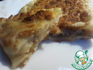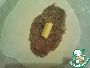 От теста отщипываем небольшие кусочки, тонко-тонко раскатываем. На одну половинку кладем фарш, «размазываем» его по тесту, кладем кусочек сливочного масла. Смазываем лепешку по периметру водой, чтобы тесто склеилось.
