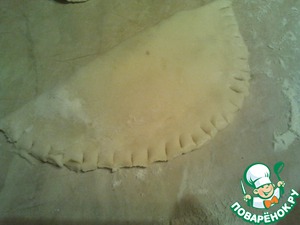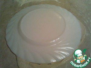 Накрываем начинку второй половиной теста, прижимаем по краям. Обрезаем тесто по тарелке.