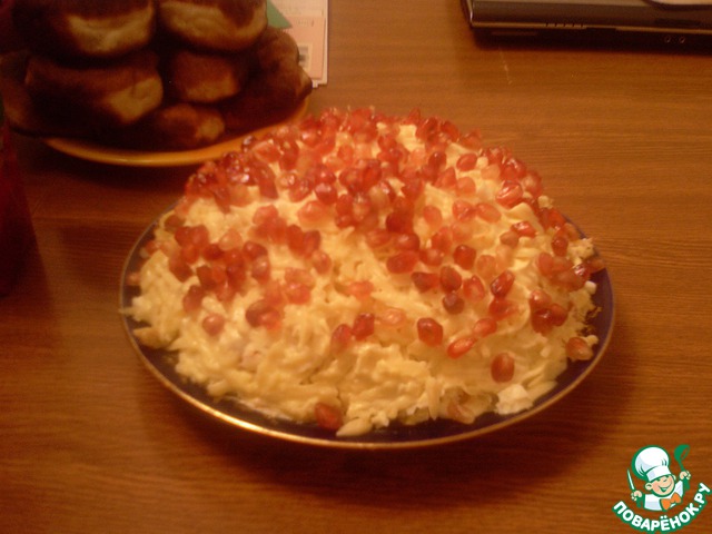 Каждый слой слегка смазывая майонезом, потом переворачиваем на тарелку, смазываем майонезом и украшаем гранатом, укропом и грецким орехом.