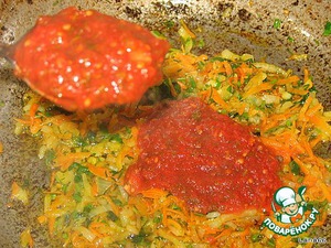 В остальную добавить помидорную заготовку или томат пасту. Прожарить и налить немного кипятка.