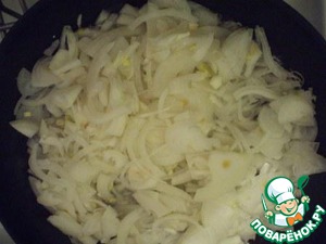 Пока готовится мясо займемся зажаркой для каши. Лук порезать полукольцами. В большую сковородку налить 10 ст. л. масла и обжарить в нем лук на среднем огне по закрытой крышкой 10 мин.