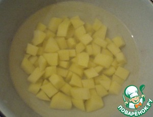 Довести до кипения и добавить мелко нарезанную картошку,
