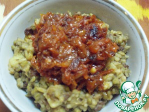 Подавать кашу с поджаркой в касушке.