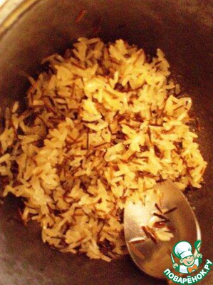 Обжарить в масле, помешивая, до тех пор пока вся вода не выпарится и рис начнет собираться в маленькие комки, похожие на гроздья кораллов. Если продолжать мешать, то гроздья распадутся и рис станет рассыпчатым. Теперь залить водой, в той пропорции как написано на упаковке, т. е. 1:2.5, посолить, довести до кипения и варить под закрытой крышкой на самом маленьком огне 35 мин.