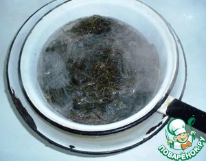 Сухую морскую капусту хорошо промыть под проточной водой и залить кипятком. Хорошо перемешать. Дать постоять 10-15 секунд.