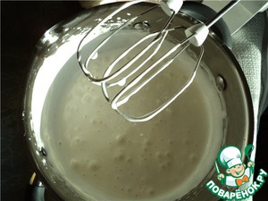 Затем понемногу добавляем сахар и взбиваем, пока сахар не растворится и масса не станет довольно крепкой. Добавлять сразу весь сахар нельзя! Совсем понемногу и постепенно, хорошо взбиваем миксером.