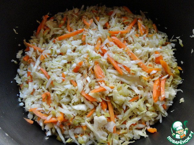 Параллельно в большой кастрюле или сковороде тушим квашеную капусту, добавив 50 мл бульона, минут 10. -