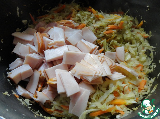 Добавляем ветчину, порезанную тонкими полосками. Перемешиваем.