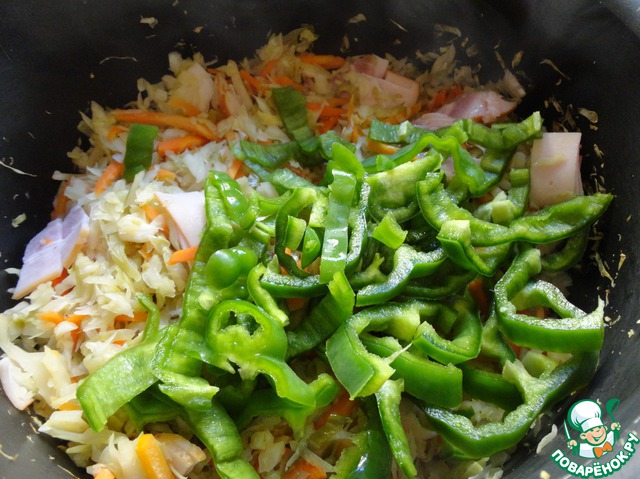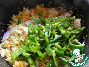Затем добавляем нарезанный перец. Перемешиваем.