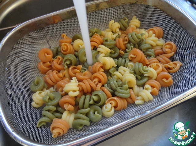 Тем временем сварились наши макароны. Промываем их холодной водой.