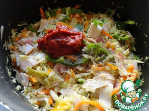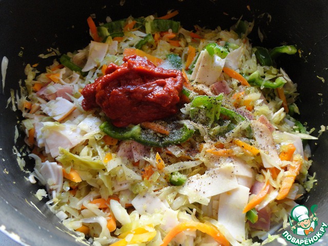 В кастрюлю с капустой добавляем оставшийся бульон, сахар, томатную пасту, перец и, если надо, соль. Перемешиваем.
