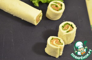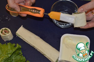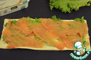 Сверху выкладываем листья салата (или рукколы), затем располагаем лосось (сёмгу) и заворачиваем рулетом вдлину. Заворачиваем в пищевую плёнку для закрепления формы. Можно оставлять его до следующего дня - хлеб не намокает и не меняет своей формы.