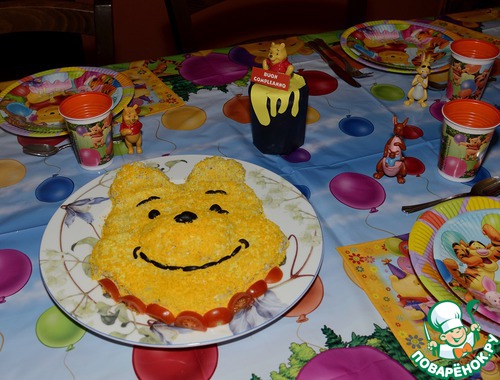 Устроили ребёнку праздник в теме Диснеевского Винни-Пуха, он же Winnie the Pooh. Торт заказывали, но хотелось сделать что-то своими руками, и в голове сразу возникла ассоциация с моим любимым "жёлтым" салатом. И маленьким, и большим понравилось!