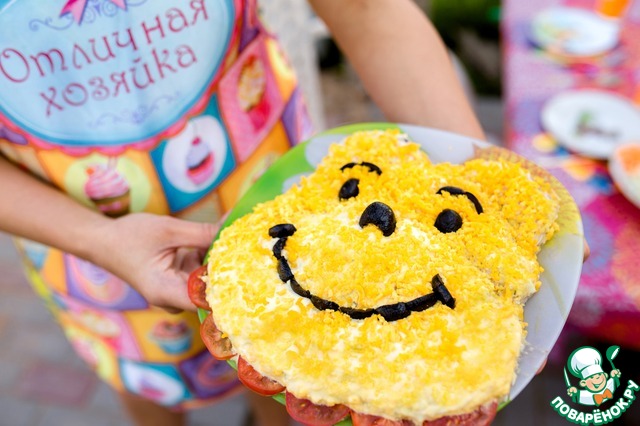 С помощью оливок сделать глаза, нос, рот, брови. Помидорами можно выложить контур воротничка.