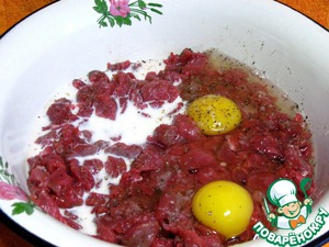 Мясо сложим в отдельную миску, посолим, поперчим, добавим яйца, молоко и тщательно перемешаем.