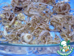 Добавим к луку гвоздику, кориандр, черый молотый перец и перемешаем. Затем лук переложим в форму для запекания.
