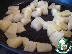 Оставшиеся ломтики ананасов порежем кубиками и обжарим на сливочном масле.