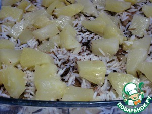 Обжаренные кубики ананаса выложим сверху. Накроем фольгой форму для запекания и поставим в духовку со средним жаром на 10 минут.