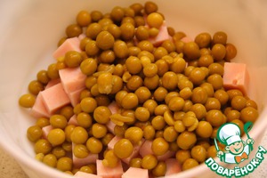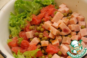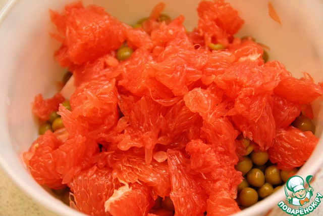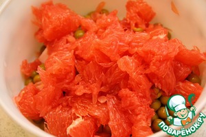 Грейпфрут очистить от белой пленки, порезать дольками. Добавить к ветчине и горошку.