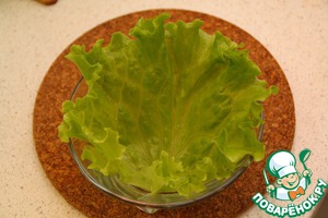 На дно пиалы положить лист салата, сверху выложить салатик. В оригинальном рецепте предлагалось салат оставить в холодном месте на 20 минут, но я бы не рекомендовала, т. к. он начинает "подтекать".