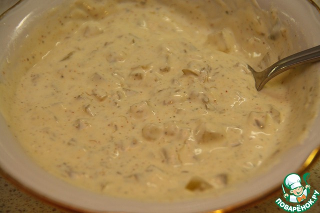 Для соуса смешать сметану, майонез и горчицу, посыпать солью, перцем, петрушкой (у меня сушеная), налить белое вино и лимонный сок.