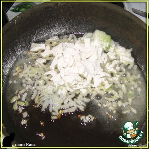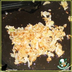 Лук нарезать меленько, обжарить на сковородке с добавлением небольшого количества муки