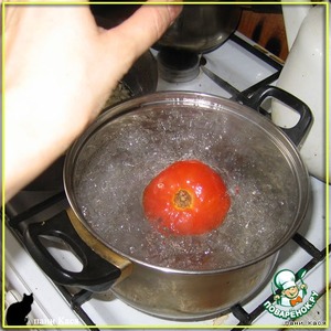 Ставим кипятить воду в такой кастрюле, чтобы вошли баклажаны, разрезанные пополам. Как закипит - кидаем помидор на 1-2 секунды, вылавливаем и снимаем шкурку.