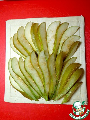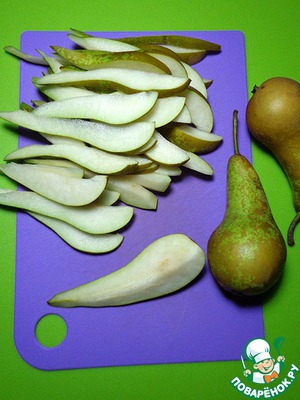 Груши режем тонкими пластинками. У меня они были ооочень маленькие, потому так много, а если среднего размера, то хватит пары штук. -