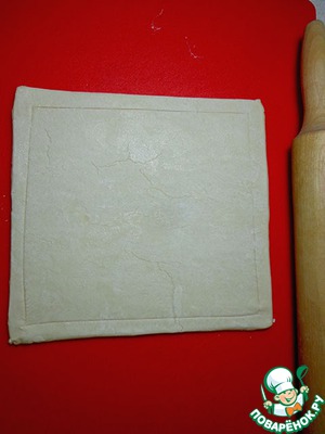 Тесто разморозить, можно слегка раскатать. Лучше это делать сразу на бумаге для выпечки. По краю провести линию острым ножом, прорезая только верхний слой.