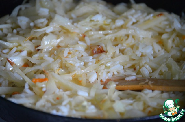 Спассеровать лук, добавить два вида капусты - тушить все 10 - 15 мин., за 5 мин до конца тушения добавить рис, посолить, поперчить по вкусу.