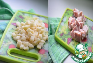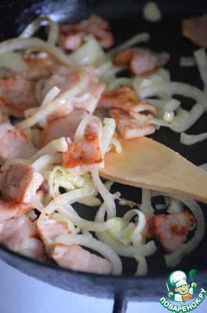 Картофель нарезать кубиками, бекон небольшими тонкими пластинами. Картофель добавить в кипящую воду (к рису).