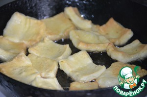 На присыпанном мукой столе раскатать тесто в пласт и нарезать на небольшие квадраты. В глубокой сковороде разогреть масло и обжарить на нем порциями лепешки до золотистого цвета (обжаренные лепешки перекладывать в дуршлаг, чтобы стекли излишки масла).
