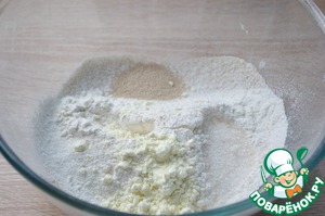 • В другой миске смешаем остальную муку - 2 стакана, дрожжи - 0,25 ч. ложки и сахар - 0,5 ст. ложки, соль.
