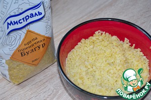 • В маленькой миске зальем булгур, кипятком (0,75 стакана), накроем крышкой и настоим в течение часа. Затем можно убрать в холодильник для дальнейшего использования.