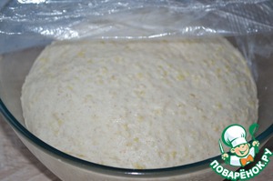 • Готовое тесто подкатываем в шар и помещаем в смазанную растительным маслом миску, накрываем полиэтиленом. Ставим в теплое место до увеличения в 2 раза.