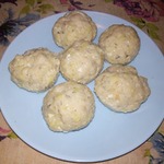 Готовим фарш из рыбы, сала (без шкурки) и жареного лука, добавляем хлеб, предварительно замоченный в молоке и отжатый, яичные желтки, соль, перец по вкусу.