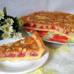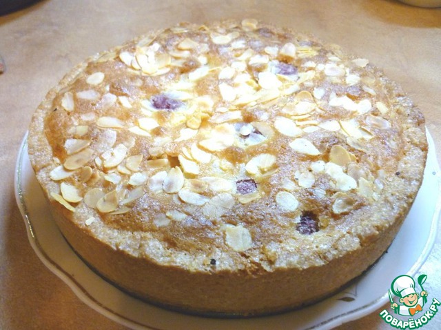 Песочный корж, прослойка из малины, хрустящая корочка с миндалем сверху. Очень вкусный пирог.