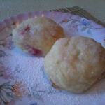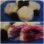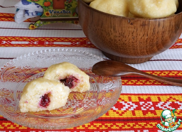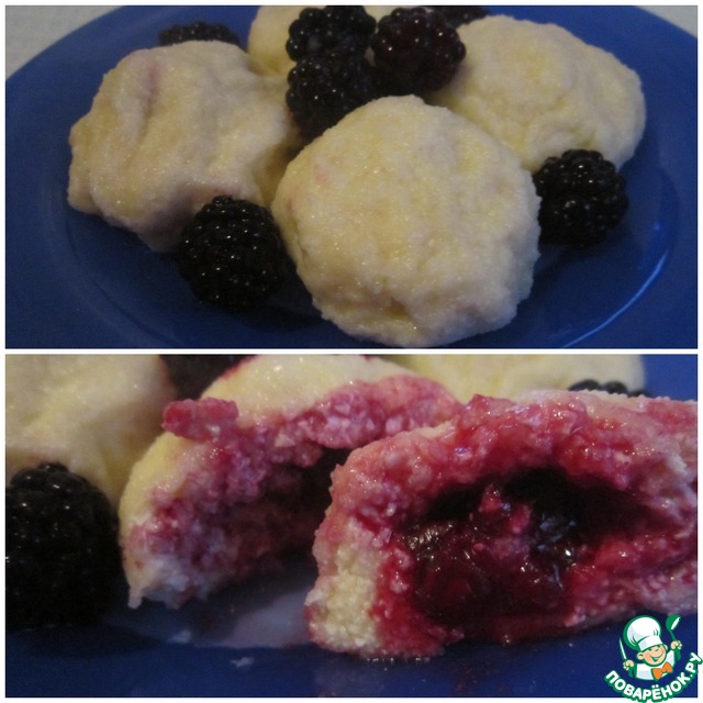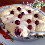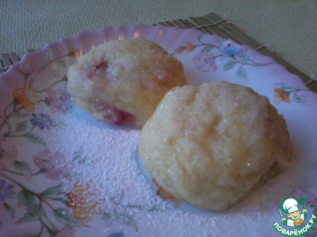 Руки пересыпать манкой. Брать тесто приблизительно 1 ст. л., сформировать на ладони лепешку, положить 2-3 вишенки.