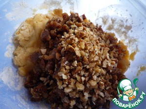 Затем добавляем муку с разрыхлителем. Муку добавлять не всю.. может уйти меньше, а может больше. Замешиваем тесто. В последнюю очередь добавляем грецкий орех и ижир. Хорошо замешиваем.