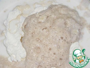 • Муку просеять в миску, в середине сделать углубление. Положить в него раскрошенные дрожжи, залить теплым молоком и 1 ст. л. сахара. Присыпать мукой. Ничего не перемешивать! Опару накрыть и поставить на 20-30 минут в теплое место. Через 25 минут она вот так выглядит.
