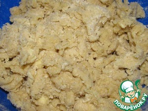 Банан размять вилкой (в рецепте сказано пюрировать блендером, если хотите, можете так сделать), масло (слегка мягкое, не растопленное!!!) порубить ножом, соединить с бананом, добавить сахар. Если Вы - счастливые обладатели банановых чипсов, то измельчите их как можно мельче и добавьте их в общую массу, я к сожалению не нашла их у нас в продаже, поэтому не использовала. Хотя и без них вкус был очень хороший и ароматный. Затем всыпать муку и пальцами втирать ее в масло с бананом, чтобы получилась крошка. Крошка выходит крупная, крупнее чем у обычного штрейзеля, потому что банан дает больше влаги. Поставить охладиться в холодильник.