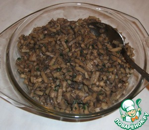 Начинка: шампиньоны моем, обсушиваем, мелко режем, добавляем нарезанный зелёный лук и обжариваем на сливочном масле, 15-20 мин, в конце жарки солим по вкусу. Остудить.